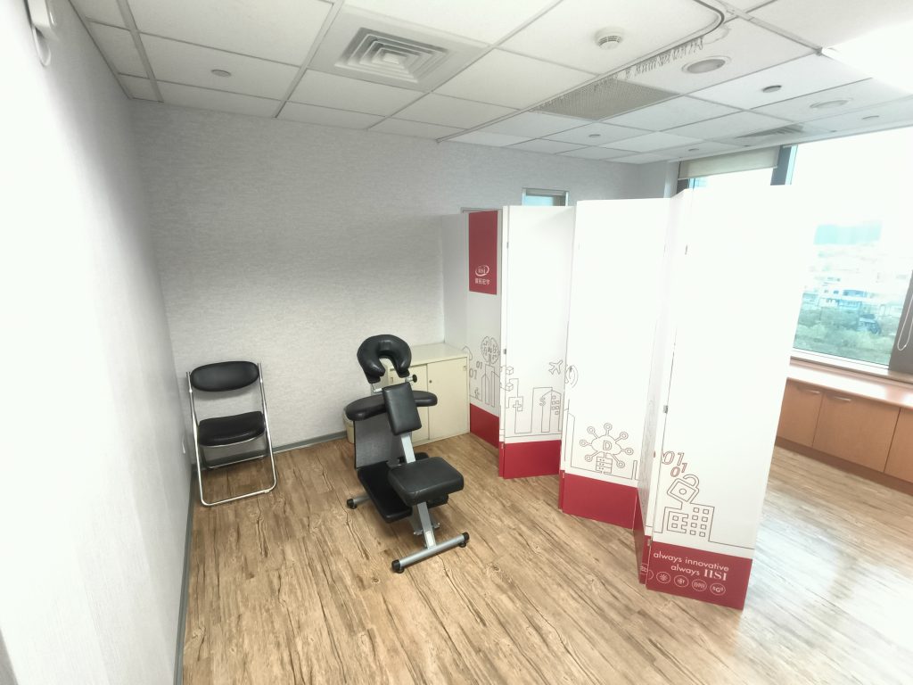 因應長時間使用電腦需求,公司設置免費舒壓按摩區,員工可線上預約按摩服務時段,紓緩上班期間的久坐與肩頸緊繃不適。