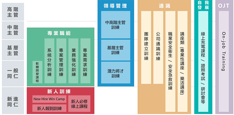 | 自我發展 | 提供多元線上課程學習管道、外部訓練機會及證照考照補助,讓同仁依需求自主學習。 |