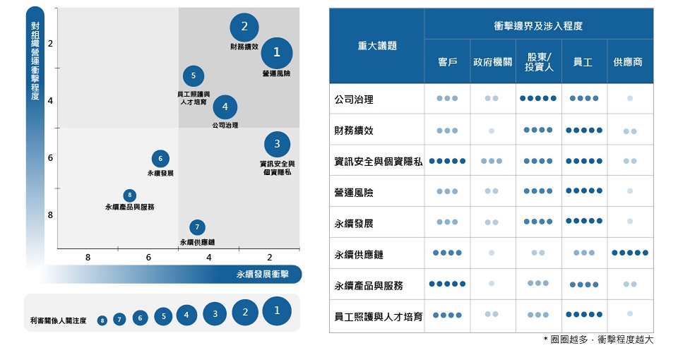 - 財務營運面向:評估主題對公司營運、風險管理、財務績效的實際或潛在影響。