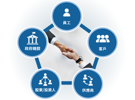 我們依據AA1000 SES 架構中五大衡量面向:依賴度、影響力、關注程度、責任、與多元觀點,透過各部門提報、專家討論與評估問卷,鑑別出與本公司高度關聯之五大關鍵利害關係人類別:員工、客戶、供應商、股東/投資人、政府機關。