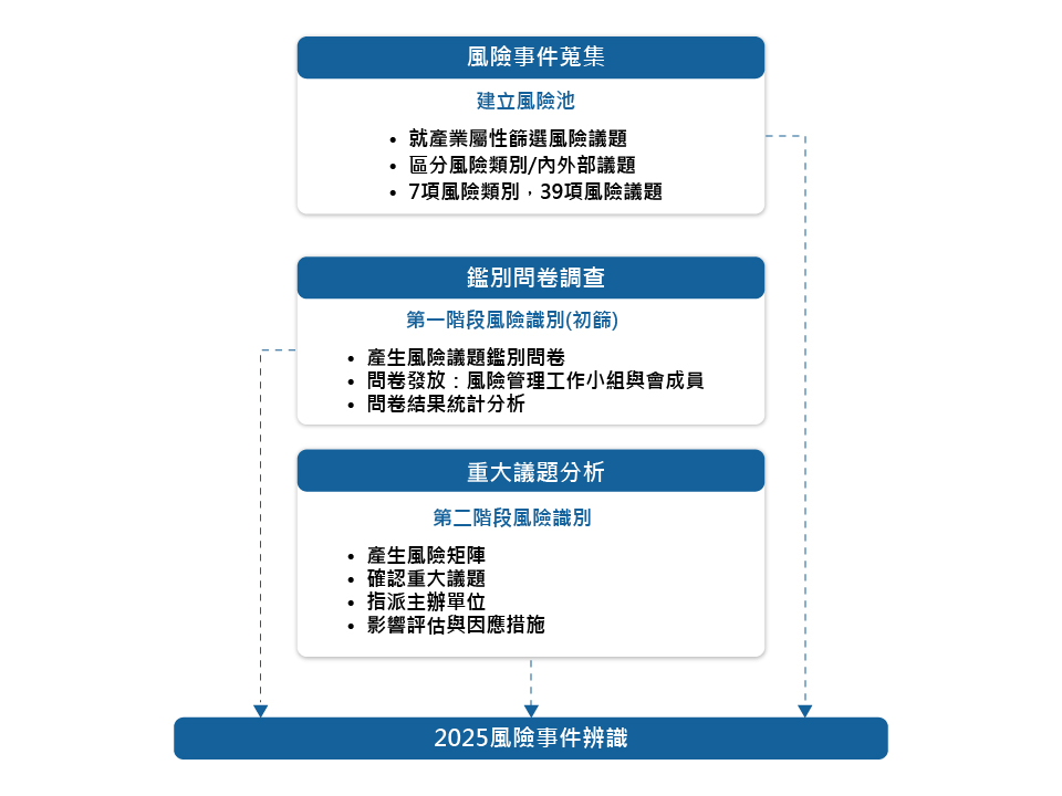 我們依循臺灣證券交易所股份有限公司及財團法人中華民國證券櫃檯買賣中心共同制定的《上市上櫃公司風險管理實務守則》規定及參考COSO ERM框架,制定本公司《風險管理作業規則》,透過系統性辨識、評估與監控風險,確保營運穩健性,並降低不確定性帶來的衝擊。主要程序包括:
