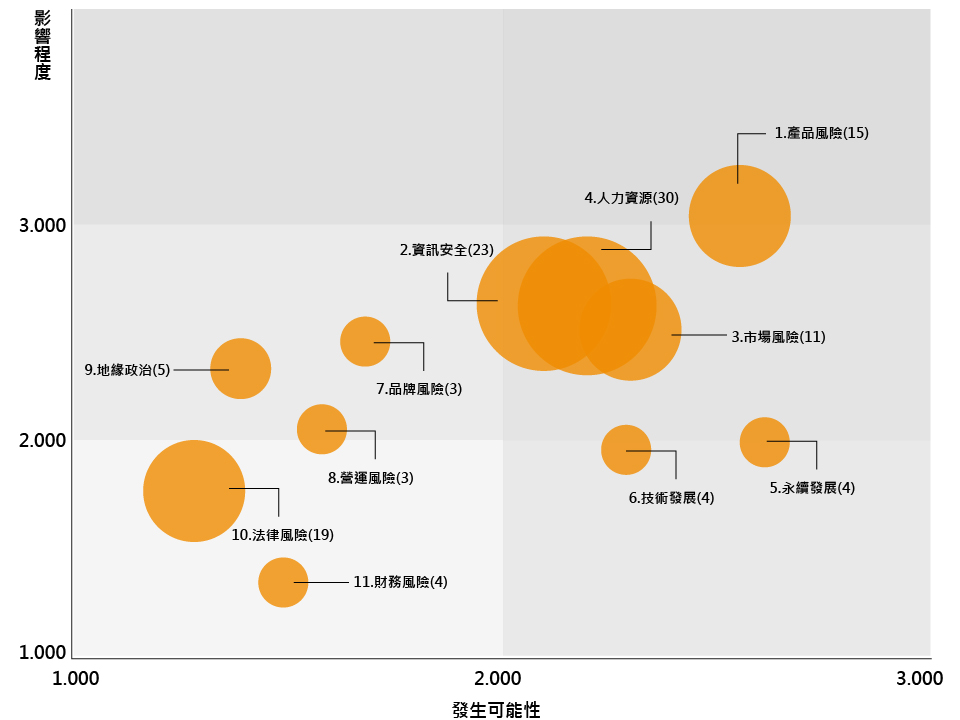 各部門以定量與定性分析方法,定期盤點業務風險,涵蓋經濟、環境、社會、法規等層面,評估其發生機率與影響,確定風險等級。