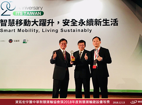 資拓宏宇和臺南市政府攜手規劃之「大臺南智慧交通中心系統功能整合擴充建置計畫」,獲中華智慧運輸協會評鑑為「2018年度智慧運輸建設優等獎」,並由資拓宏宇領獎代表蕭偉政副總經理(右一)於「ITS 20週年智慧運輸應用研討會暨成果展示」大會中接受表揚,該計畫以建置全方位智慧交通中心為目標,藉由智慧科技調控方式,讓用路人體驗到大臺南的安全、舒適、順暢與便捷的智慧交通環境。